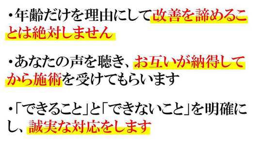 人は年齢とともにさまざまな変化が現れるのは事実です。しかしそのすべてを加齢だけのせいにして改善を諦めるようなことはしません。本当の原因をつきとめ、これを全力で施術する。これが施術家の義務だと思っています。